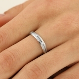 Verigheta dama din aur alb 18kt lustruita si rotunjita cu margini coborate, cu 3 diamante asezate intr-o canelura in jurul centrului inelului cu setare in rub over.Partea de sus a inelului este sablata, iar marginile coborate sunt foarte lustruite.Greutatea totala a diamantelor este 0.04ct, calitatea este GVS2. Latimea inelului este 3.5mm.